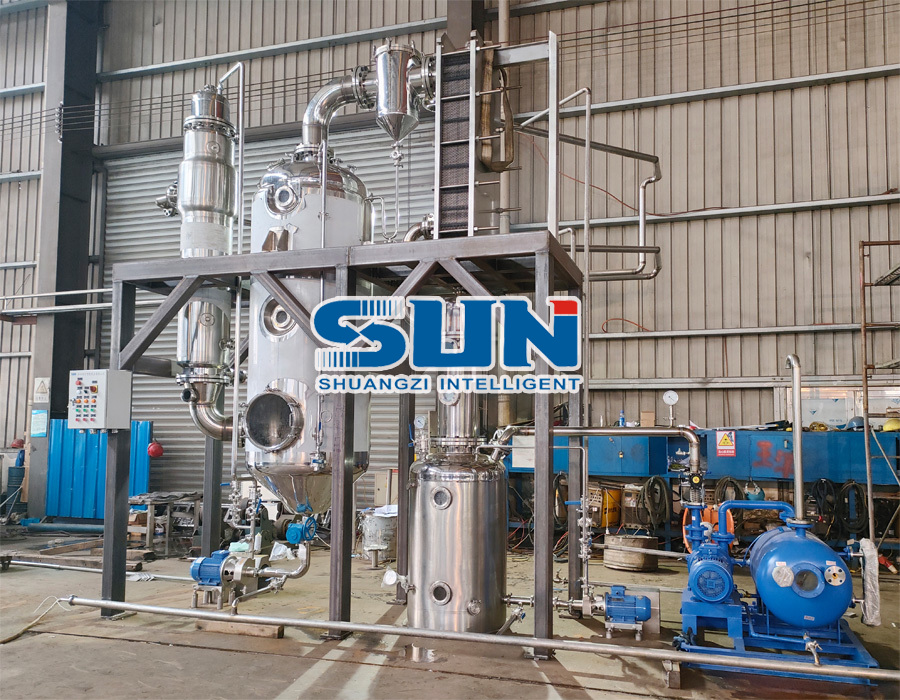 El equipo consiste principalmente en un calentador, un separador, un condensador, etc. Durante la operación, el líquido de alimentación se distribuye uniformemente a la pared interna del tubo de calentamiento a través de un distribuidor, formando una película que cae uniforme impulsada por la gravedad y el vapor secundario. El vapor se introduce en el exterior del tubo de calentamiento y el calor se transfiere a través de la pared del tubo para hervir rápidamente y vaporizar el líquido de alimentación. El vapor secundario generado y el líquido concentrado ingresan al separador para la separación. El vapor secundario se condensa y descarga, mientras que el líquido concentrado se recoge después de alcanzar la concentración objetivo.