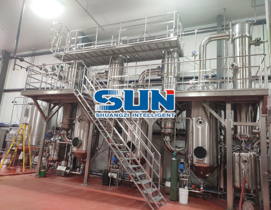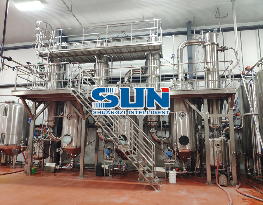 El evaporador de películas de tres efectos que caen es un equipo de evaporación y concentración eficiente y ahorrador de energía basado en el principio de evaporación de efectos múltiples. Se utiliza ampliamente en industrias como alimentos, medicina e ingeniería química. Su aplicación central se encuentra en la deshidratación y concentración de materiales de solución acuosa (como extractos de medicamentos tradicionales chinos, jugo de frutas, productos lácteos, sopa de huesos, aguas residuales industriales, etc.), para mejorar el contenido sólido del material.