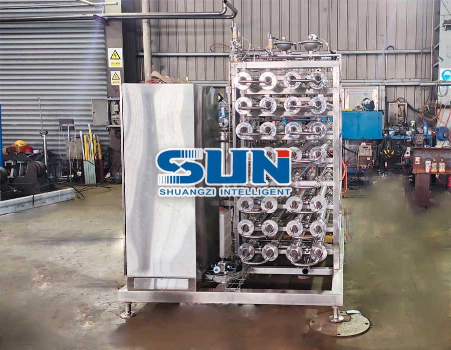 El esterilizador tubular UHT se usa ampliamente en leche, jugos, bebidas de té, extractos de hierbas chinas y otros productos. El equipo se utiliza principalmente en el proceso de esterilización y enfriamiento de diversos materiales concentrados. Se compone de un tanque de almacenamiento de material, un tanque de agua sobrecalentada, una bomba, un intercambiador de calor tubular, un sistema de control PLC, un gabinete de control, un sistema de admisión de vapor, una válvula, un interruptor de inducción, etc. Esta máquina es adecuada para todo tipo de procesos de esterilización y enfriamiento de materiales concentrados, el rango de viscosidad del producto es amplio y puede adaptarse a fibras y partículas. Fácil coquización, largo tiempo de producción. Alto coeficiente de transferencia de calor: el intercambiador de calor tubular, el material y el medio de intercambio de calor funcionan en estado turbulento, la eficiencia del intercambio de calor es alta, se reduce la incrustación y se aumenta el tiempo de trabajo continuo de la máquina de esterilización. Completamente comparable con equipos importados. Alta eficiencia térmica: una vez calentado el material, se puede recuperar más del 90% de la energía térmica. No hay punto de contacto en el tubo, ni ángulo muerto sanitario, el producto no se adhiere al tubo y no es fácil de escalar: y los fuelles forman una alta turbulencia en el proceso de esterilización y tienen un efecto de autolimpieza en el proceso de flujo de material, por lo que no es fácil formar incrustaciones y contaminación en el tubo.